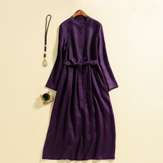 린넨원피스 자체디자인 가을겨울 코튼린넨 롱스커트 2019가을옷 여행 문예 스탠딩카라 긴팔 린넨 보라색 원피스 안감있음