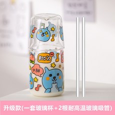 예쁜 쿠우쿠우 내열유리컵 1인용 세트 그릇 굿즈 식기세트 홈카페 밀크티잔 물 우유잔 유리잔, 1인 유리컵 + 2개의 빨대