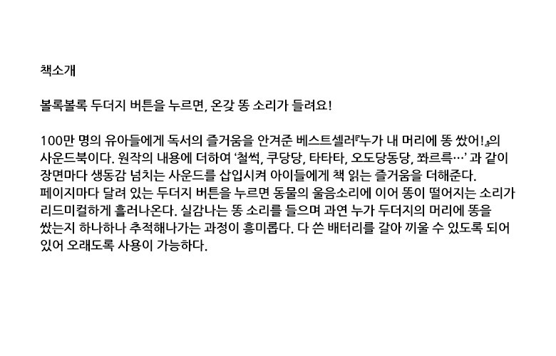 | 목차 또는 책소개(아동용 학습 교재의 경우 사용연령을 포함) | 100만 명의 유아들에게 독서의 즐거움을 안겨준 베스트셀러『누가 내 머리에 똥 쌌어!』의 사운드북이다. 원작의 내용에 더하여 ‘철썩, 쿠당당, 타타타, 오도당동당, 쫘르륵…’ 과 같이 장면마다 생동감 넘치는 사운드를 삽입시켜 아이들에게 책 읽는 즐거움을 더해준다. 페이지마다 달려 있는 두더지 버튼을 누르면 동물의 울음소리에 이어 똥이 떨어지는 소리가 리드미컬하게 흘러나온다. 실감나는 똥 소리를 들으며 과연 누가 두더지의 머리에 똥을 쌌는지 하나하나 추적해나가는 과정이 흥미롭다. 다 쓴 배터리를 갈아 끼울 수 있도록 되어 있어 오래도록 사용이 가능하다. |