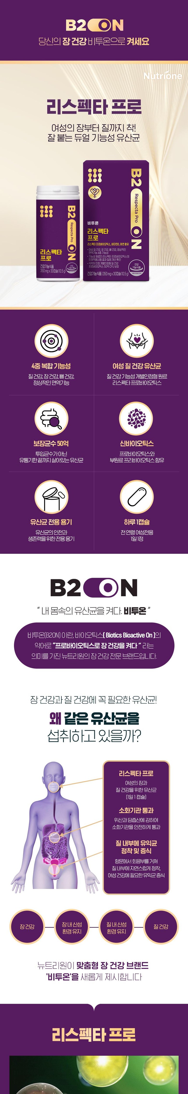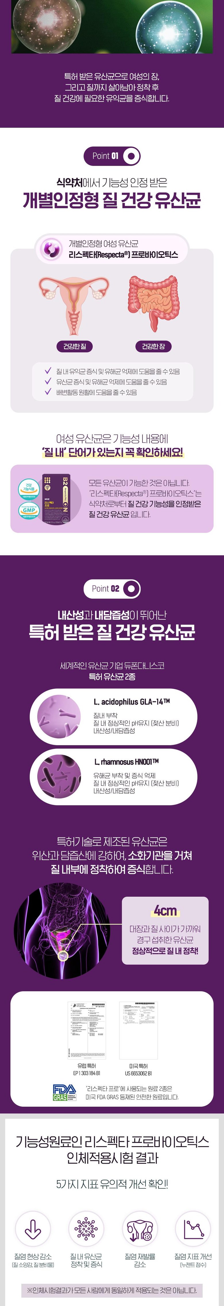 | 기능정보 | 리스펙타프로바이오틱스(기능성원료인정 제2019-26호)] 질내 유익균 증식 및 유해균 억제에 도움을 줄 수 있음[아연] 정상적인 면역기능에 필요, 정상적인 세포 분열에 필요[비타민D] 칼슘과 인이 흡수되고 이용되는데 필요, 뼈의 형성과 유지에 필요, 골다공증발생 위험 감소에 도움을 줌 |
