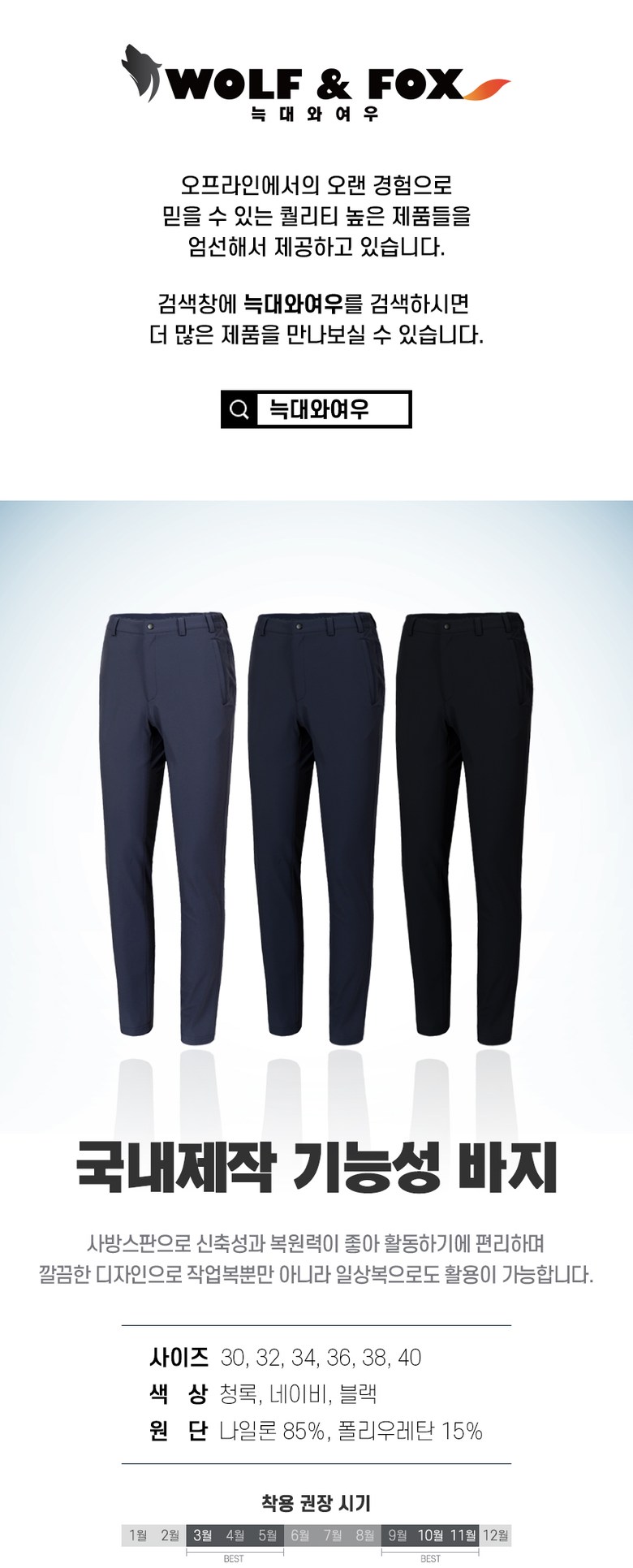 늑대와여우 남성 봄가을 무지 기능성 사방스판 골프웨어 등산바지 트레이닝바지
