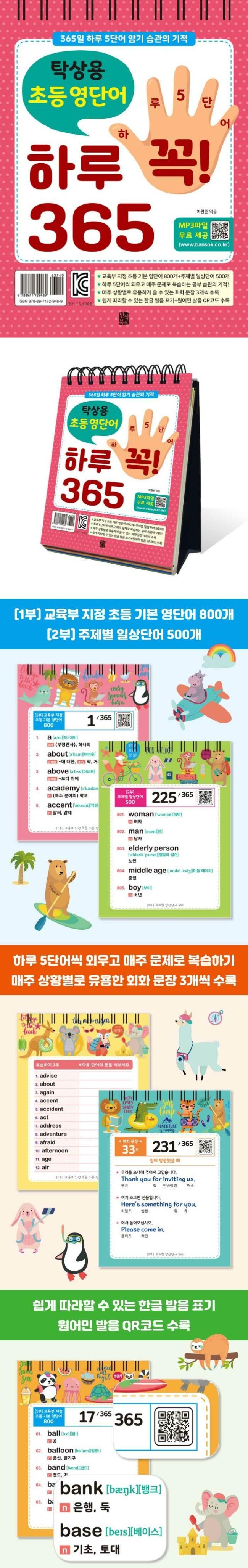 | 도서명 | [반석북스]탁상용 초등 영단어 하루 꼭! 365 : 365일 하루 5단어 암기 습관의 기적 (스프링) |