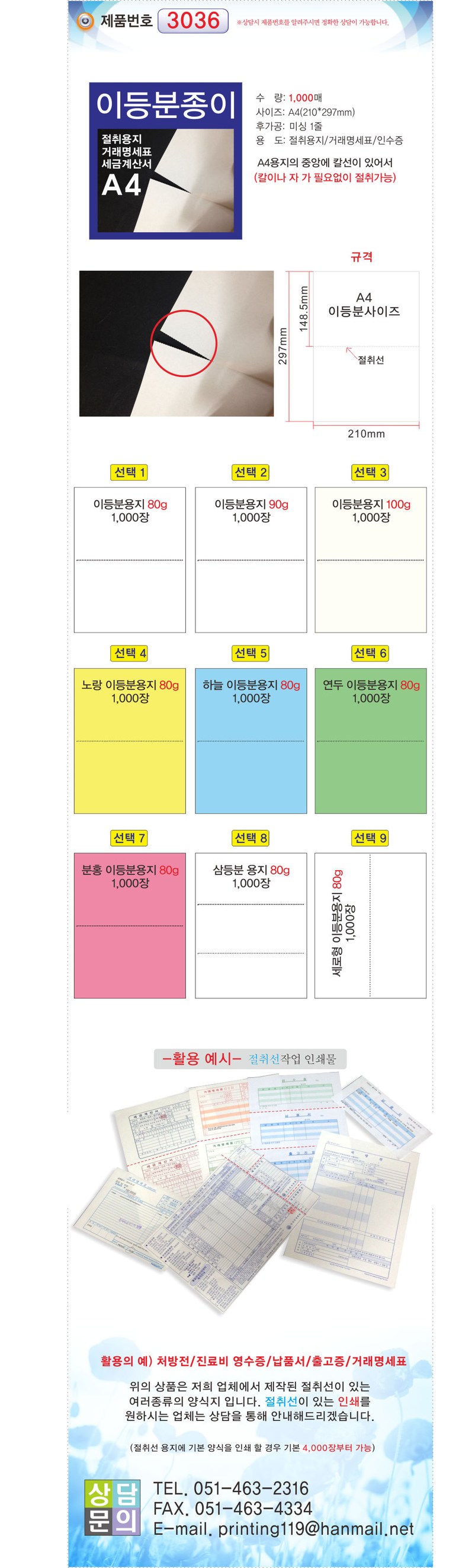 부산인쇄3036-1 이등분용지 절취선용지 거래명세서출력용지, A4
