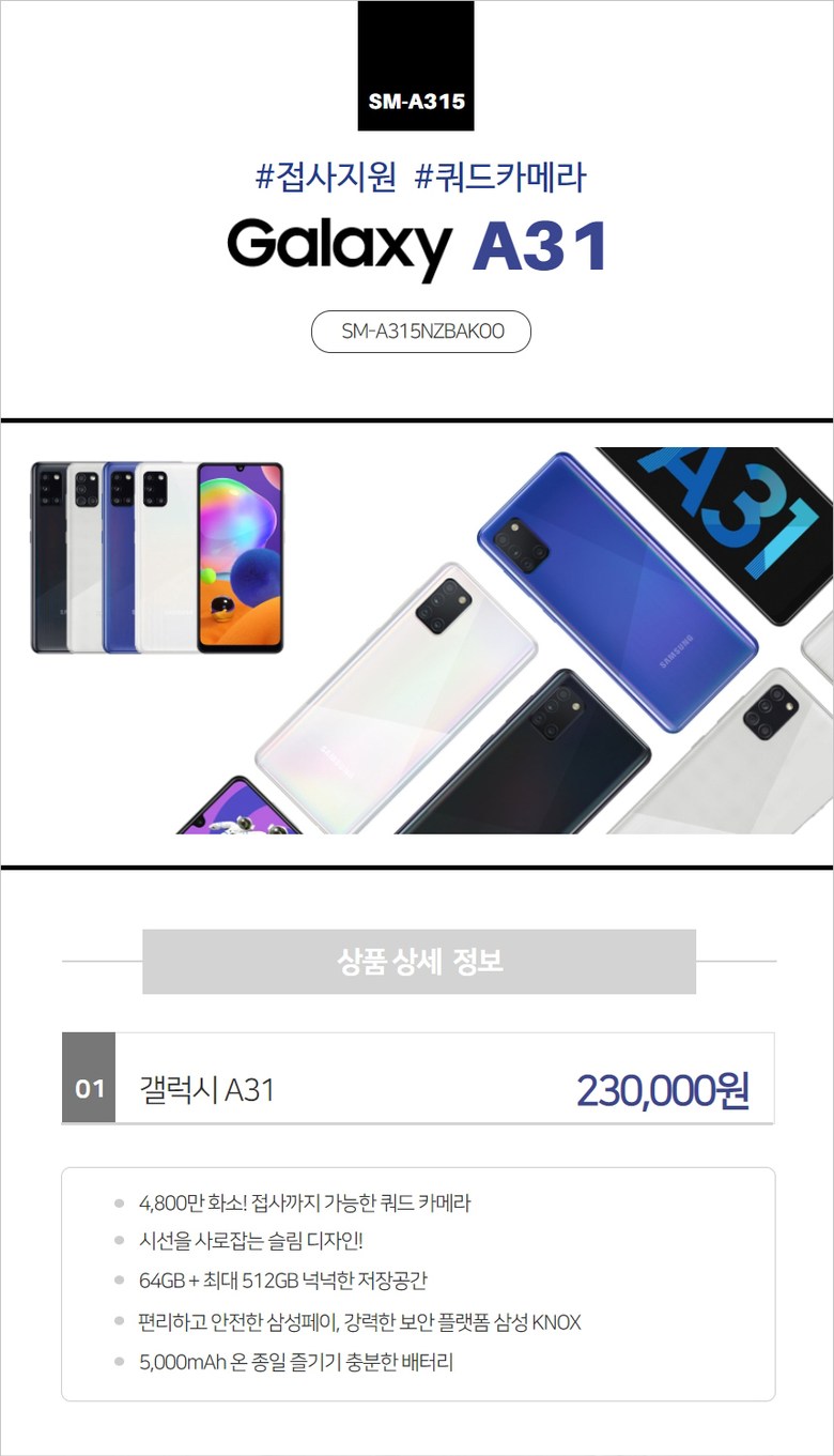 삼성 갤럭시 A31 효도폰 세컨폰 요금제자유 알뜰폰 A315, 실버