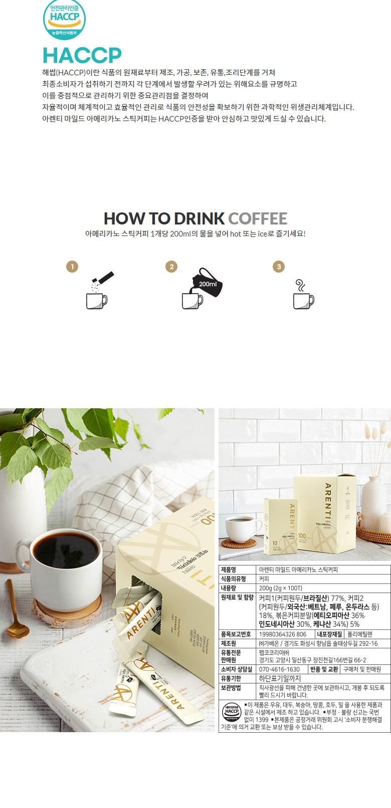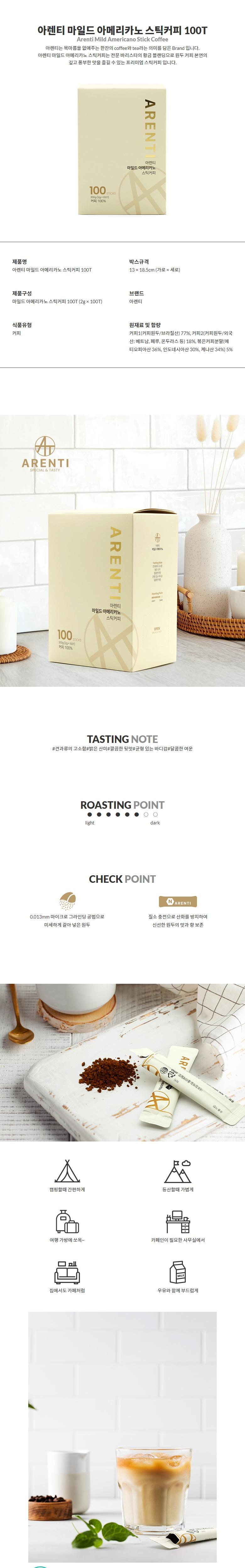 | 제품명 | 아렌티 마일드 아메리카노 스틱커피 100T |