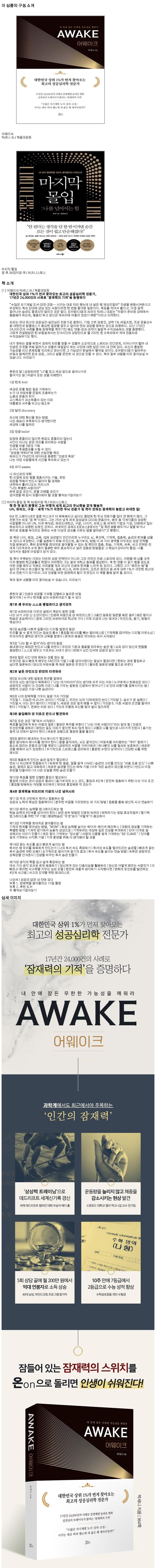 | 목차 또는 책소개(아동용 학습 교재의 경우 사용연령을 포함) | 어웨이크 + 마지막 몰입 : 나를 넘어서는 힘 세트 전2권 |