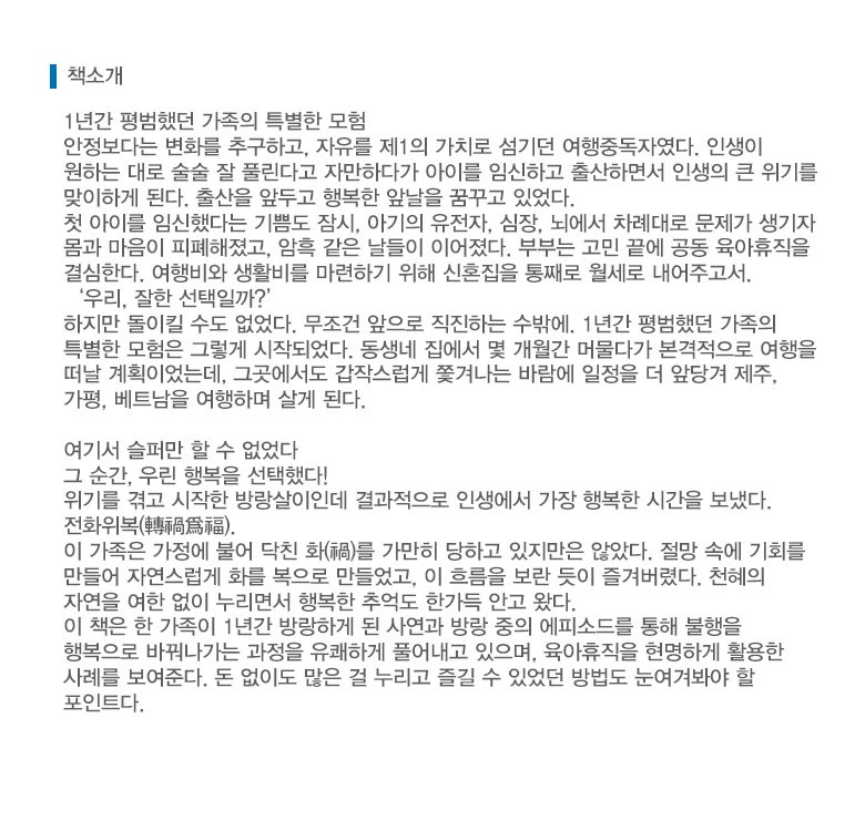 목차 또는 책소개(아동용 학습 교재의 경우 사용연령을 포함) 1년간 평범했던 가족의 특별한 모험 안정보다는 변화를 추구하고, 자유를 제1의 가치로 섬기던 여행중독자였다. 인생이 원하는 대로 술술 잘 풀린다고 자만하다가 아이를 임신하고 출산하면서 인생의 큰 위기를 맞이하게 된다. 출산을 앞두고 행복한 앞날을 꿈꾸고 있었다. 첫 아이를 임신했다는 기쁨도 잠시, 아기의 유전자, 심장, 뇌에서 차례대로 문제가 생기자 몸과 마음이 피폐해졌고, 암흑 같은 날들이 이어졌다. 부부는 고민 끝에 공동 육아휴직을 결심한다. 여행비와 생활비를 마련하기 위해 신혼집을 통째로 월세로 내어주고서. ‘우리, 잘한 선택일까?’ 하지만 돌이킬 수도 없었다. 무조건 앞으로 직진하는 수밖에. 1년간 평범했던 가족의 특별한 모험은 그렇게 시작되었다. 동생네 집에서 몇 개월간 머물다가 본격적으로 여행을 떠날 계획이었는데, 그곳에서도 갑작스럽게 쫓겨나는 바람에 일정을 더 앞당겨 제주, 가평, 베트남을 여행하며 살게 된다.