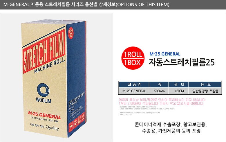 | 품명 및 모델명 | 머신용 공업용랩 랩 포장랩 산업용 자동스트레치필름 25 (M-25 GENERAL x 1200M 1롤) |