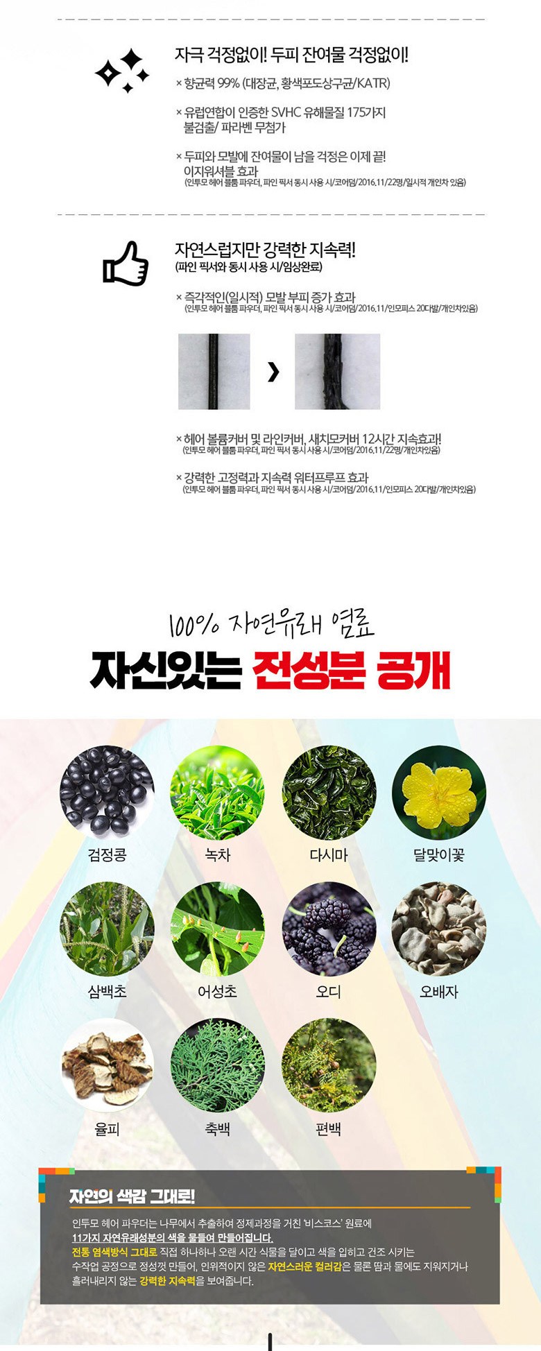 | 화장품법에 따라 기재, 표시하여야 하는 모든 성분 | 비스코스(독일),오배자 열매(경북 울진),율피(충남 아산),편백나무(경북 울진),측백잎(경북 영천),어성초(경북 영천),달맞이꽃씨(경북 경주),삼백초(경북 영천),검은콩(충북 청주),다시마(전북 완도),녹차(경남 하동),오디(충북 괴산) |
