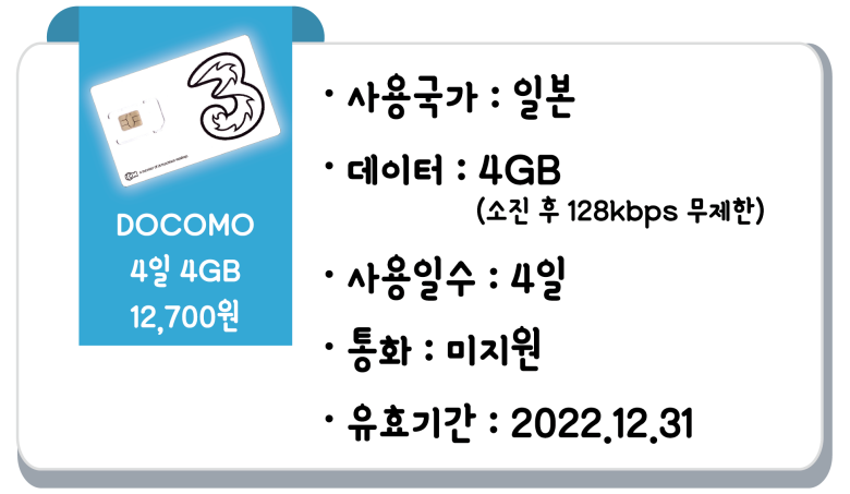 일본유심 도코모 소프트뱅크 유심, 도코모 4일 4GB 저속무제한