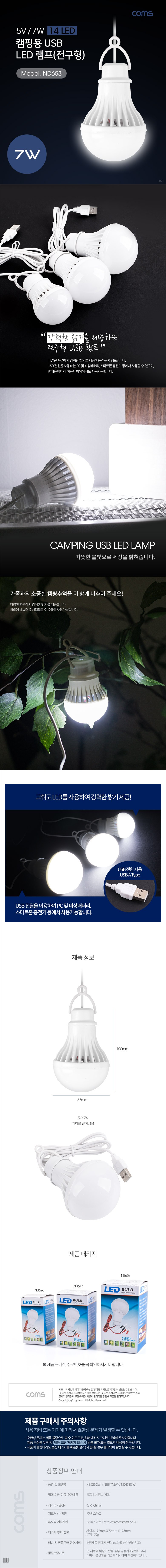 캠핑용 USB 램프 / 전구형 / 5V 7W / 14LED / 1M / 화이트 / 램프, ND653