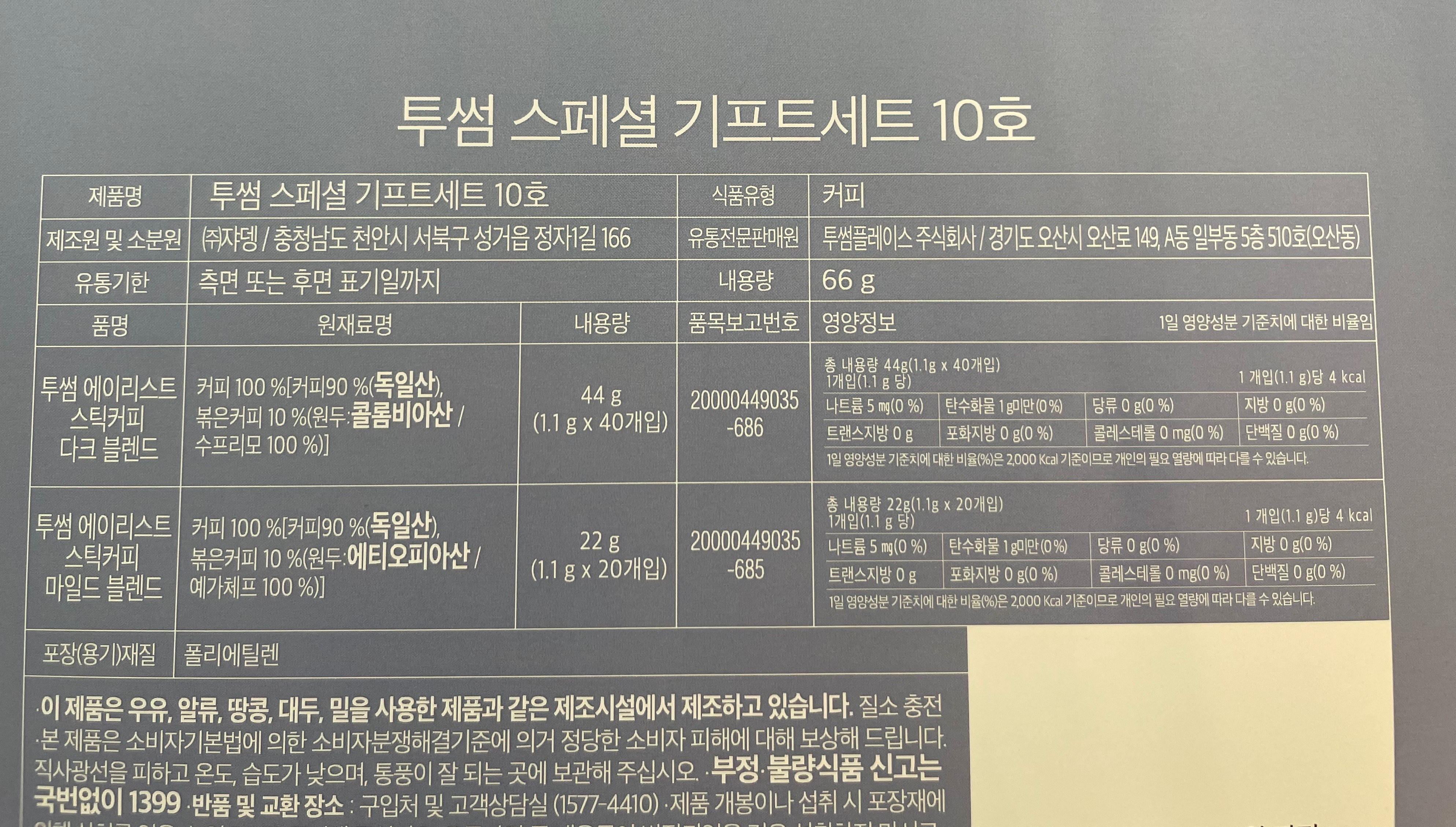| 제품명 | 투썸 에이리스트 스틱커피 다크블렌드, 투썸 에이리스트 스틱커피 마일드 블렌드 |