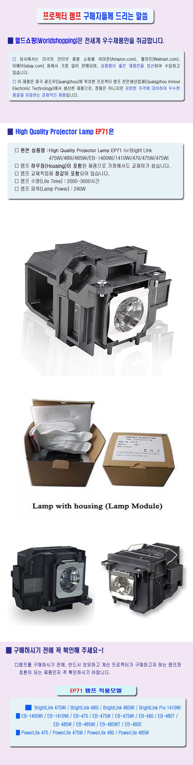 프로젝터 램프(EP71) EB-1400Wi/EB-1410Wi/EB-470/EB-475W/EB-475Wi/EB-480/EB-480T/EB-485W/EB-485Wi/ELPLP71, 프로젝터 램프 EP71