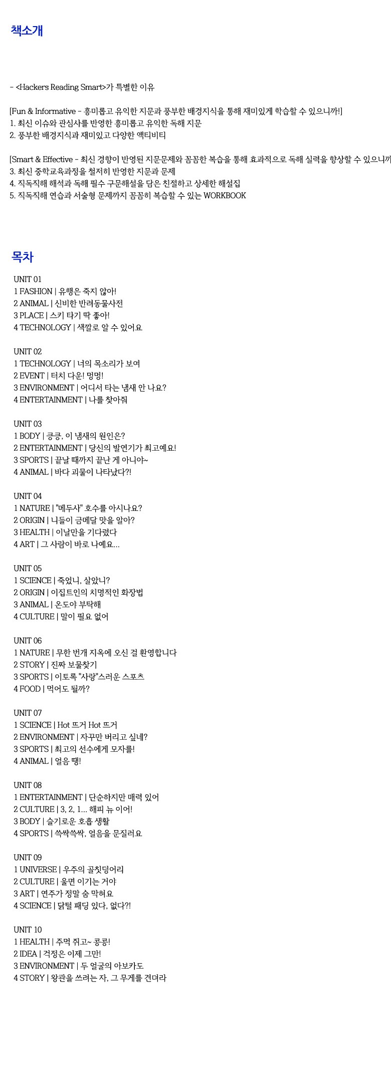 | 목차 또는 책소개(아동용 학습 교재의 경우 사용연령을 포함) | 중고등참고서 전체 베스트셀러 1위! 1위 해커스가 출간한 , 중고등 영어도 역시 1위 해커스입니다.- 가 특별한 이유[Fun & Informative – 흥미롭고 유익한 지문과 풍부한 배경지식을 통해 재미있게 학습할 수 있으니까!]1. 최신 이슈와 관심사를 반영한 흥미롭고 유익한 독해 지문2. 풍부한 배경지식과 재미있고 다양한 액티비티[Smart & Effective – 최신 경향이 반영된 지문문제와 꼼꼼한 복습을 통해 효과적으로 독해 실력을 향상할 수 있으니까!]3. 최신 중학교육과정을 철저히 반영한 지문과 문제4. 직독직해 해석과 독해 필수 구문해설을 담은 친절하고 상세한 해설집5. 직독직해 연습과 서술형 문제까지 꼼꼼히 복습할 수 있는 WORKBOOKUNIT 011 FASHION | 유행은 죽지 않아!2 ANIMAL | 신비한 반려동물사전3 PLACE | 스키 타기 딱 좋아!4 TECHNOLOGY | 색깔로 알 수 있어요UNIT 021 TECHNOLOGY | 너의 목소리가 보여2 EVENT | 터치 다운! 멍멍!3 ENVIRONMENT | 어디서 타는 냄새 안 나요?4 ENTERTAINMENT | 나를 찾아줘UNIT 031 BODY | 킁킁, 이 냄새의 원인은?2 ENTERTAINMENT | 당신의 발연기가 최고예요!3 SPORTS | 끝날 때까지 끝난 게 아니야~4 ANIMAL | 바다 괴물이 나타났다?!UNIT 041 NATURE | “메두사” 호수를 아시나요?2 ORIGIN | 니들이 금메달 맛을 알아?3 HEALTH | 이날만을 기다렸다4 ART | 그 사람이 바로 나예요…UNIT 051 SCIENCE | 죽었니, 살았니?2 ORIGIN | 이집트인의 치명적인 화장법3 ANIMAL | 온도야 부탁해4 CULTURE | 말이 필요 없어UNIT 061 NATURE | 무한 번개 지옥에 오신 걸 환영합니다2 STORY | |