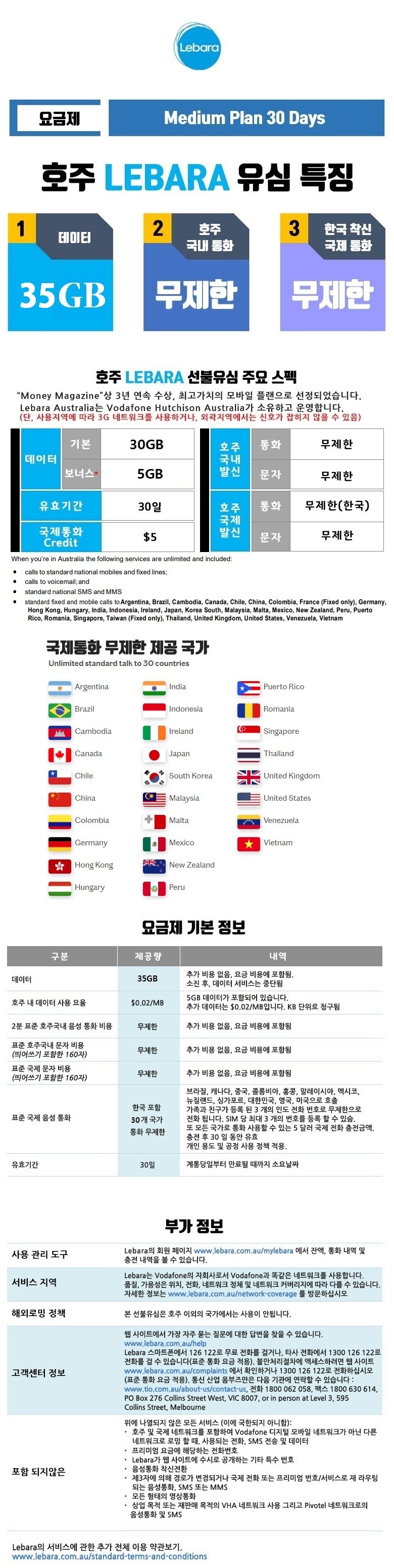 호주 로컬유심 한국국제통화포함, LEBARA 무제한국제통화, 1개