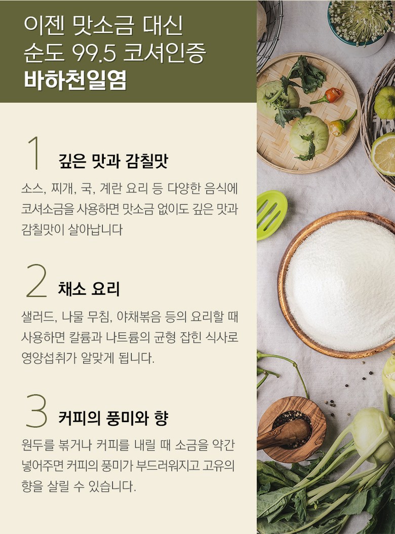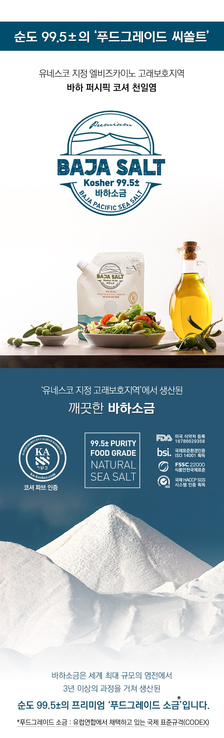 | 제조연월일(포장일 또는 생산연도), 유통기한 | 제조연월일: 2021.07.09유통기한: 2026.08.01식품위생법에 따르면 천일염은 유통기한 생략가능 식품으로 명시되어 있습니다. 그러나 ‘푸드포트’를 통해 공식 유통되는 ‘바하 퍼시픽 천일염’은 따로 간수를 제거할 필요가 없는 초 고순도의 천일염이기 때문에 최상의 품질 유지를 위해 제조사인 ESSA와 함께 소금이 생산된 ‘제조일자’와 ‘유통기한’을 표시하는 정책을 사용하고 있습니다. |