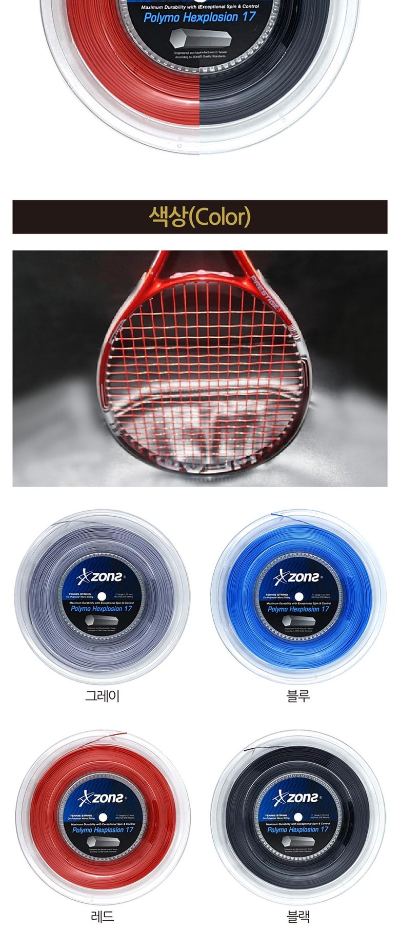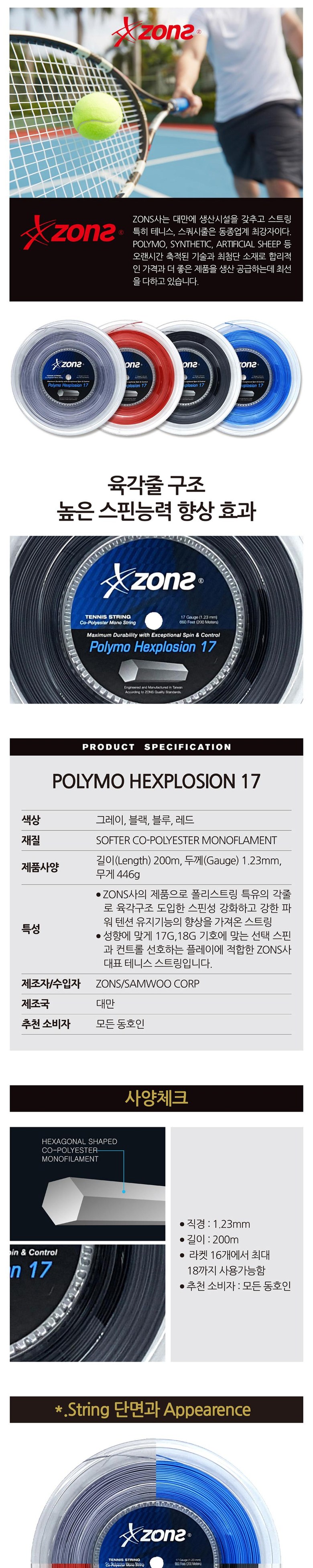 존스 폴리모 헥스플로전 17 육각 1.23mm 200M 릴 테니스 스트링, 그레이