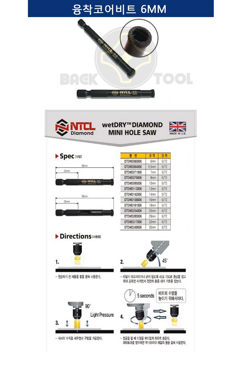 NTCL 융착코어비트 6mm ~ 35mm 강화타일천공 타일기리 티비설치 TV설치 유리 대리석 홀쏘 영국제 코아비트