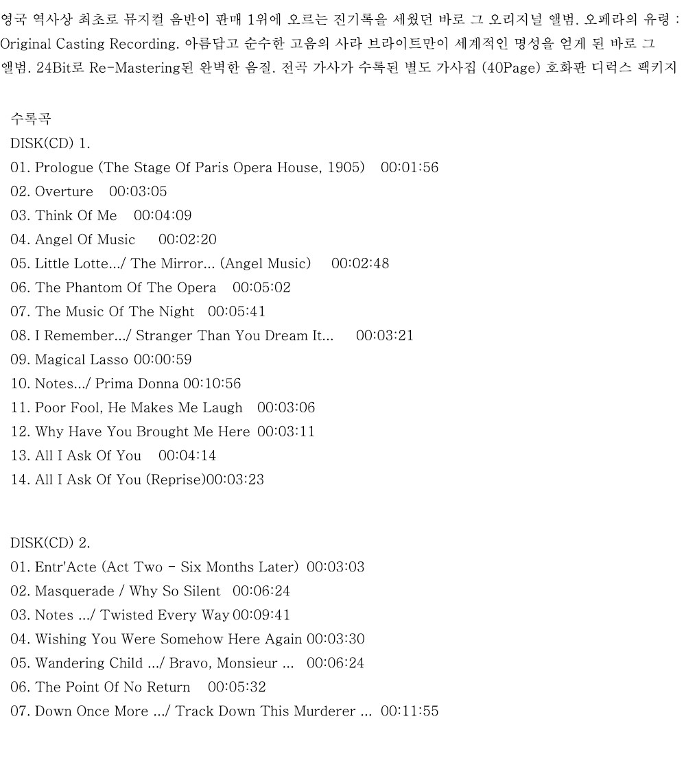 | 품명 및 모델명 | Phantom Of The Opera – Original Cast Recording (2CD) / 오페라의 유령 – 오리지날 캐스트 레코딩 |